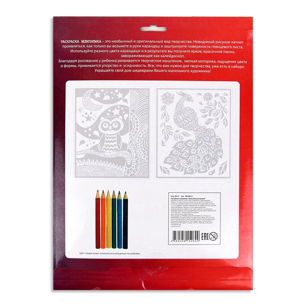 Внутри картонного конверта вас ждут две белоснежные прямоугольные основы с шероховатой поверхностью. Скоро на них будет сидеть пушистая сова, наслаждаясь тишиной летней ночи, а рядом с ней распустит свой великолепный пышный текст золотисто-красный павлин. Как же нарисовать такие замечательные картины? Вам на помощь уже спешат пять разноцветных помощников – это карандаши, которые тоже входят в набор. Начните заштриховывать лист, чтобы увидеть, как невидимые рисунки начинают проявляться и оживать на глазах!