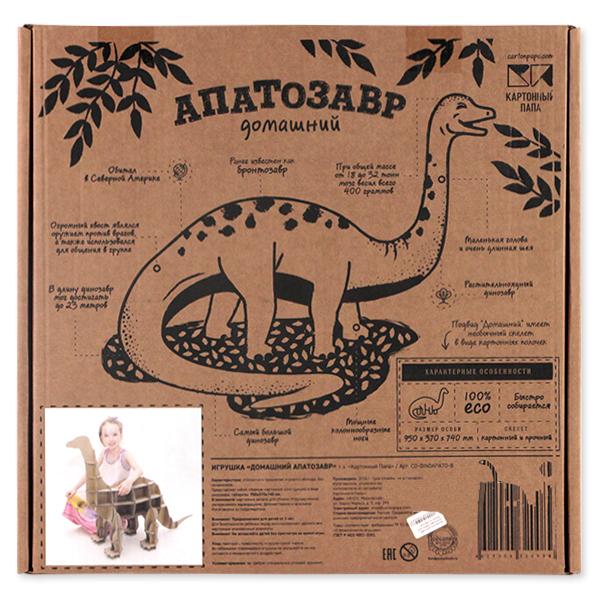В набор входят детали из гофрокортона для сборки и инструкция. На коробке помещена познавательная информация о древнем животном. Фигура апатозавра собирается быстро. Готовая модель смотрится довольно внушительно. Она достигает 0,95 м в длину, 0,74 м в высоту и 0,37 м в глубину. Украсьте ее гуашью или акриловыми красками!