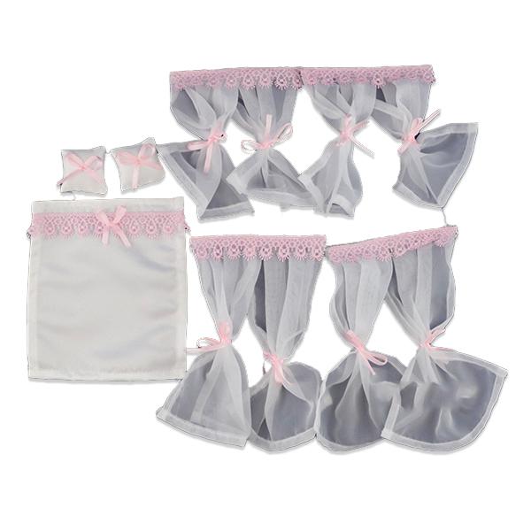 Занавески для кукольного домика – набор белоснежного воздушного текстиля для кукольного домика. В комплекте к шторам прилагаются подушки и покрывала для кроватки с нежно-розовыми кружевными мотивами.
