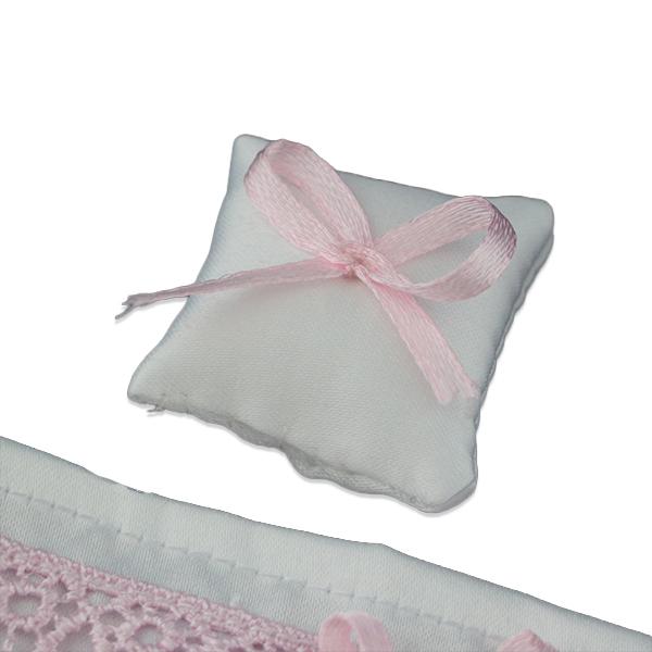 Покрывала и подушечки идеально подходят для деревянной кроватки из серии «Одним прекрасным утром». Они сшиты из ослепительно белого сатина и украшены кружевными розовыми элементами. Учите ребенка застилать постель на примере этого комплекта.